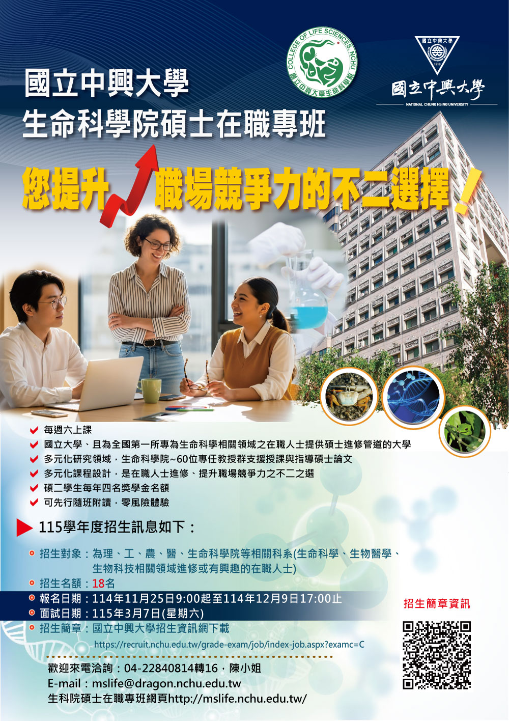 招生簡章: 國立中興大學招生資訊網下載歡迎來電洽詢:04-22840814轉16, 陳小姐E-mail
